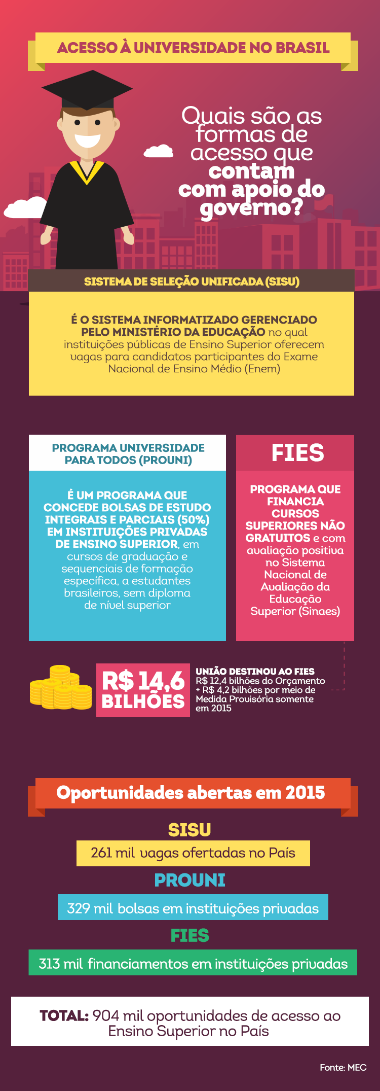 Três programas de governo têm garantido o ingresso de estudantes em cursos de graduação públicos e privados no País. Seja gratuitamente, por meio de bolsas ou ainda na modalidade de financiamento, foram criadas mais de 904 mil vagas de acesso à universidade somente em 2015, graças a ProUni, Fies e Sisu.