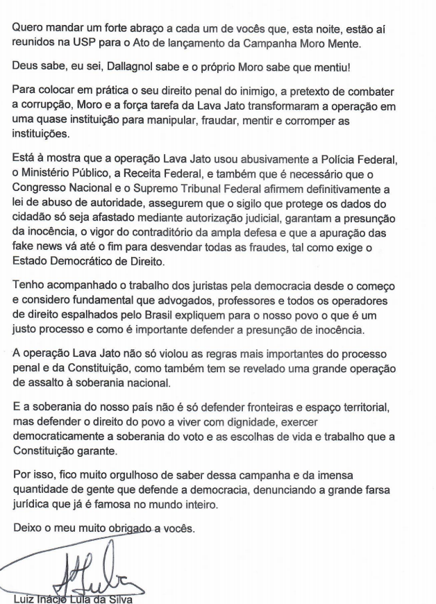 Em carta ao lançamento da campanha Moro Mente realizada pela Associação dos Juristas pela Democracia (ABJD), o ex-presidente Luiz Inácio Lulada Silva aponta os abusos da operação Lava Jato e os riscos que representa à democracia e soberania nacional.
