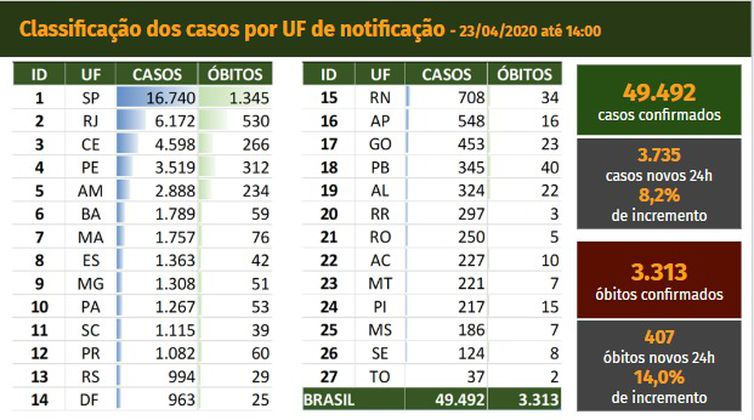 O Brasil teve 407 novas mortes nas últimas 24 horas em razão da pandemia do novo coronavírus (covid-19), o maior número neste período desde o início da contagem. No total, o país soma 3.313 óbitos, 49.492 mil casos confirmados da doença e 26.573 pacientes recuperados. Ainda de acordo com os dados divulgados hoje (23) pelo Ministério da Saúde, 19.606 casos estão em acompanhamento.